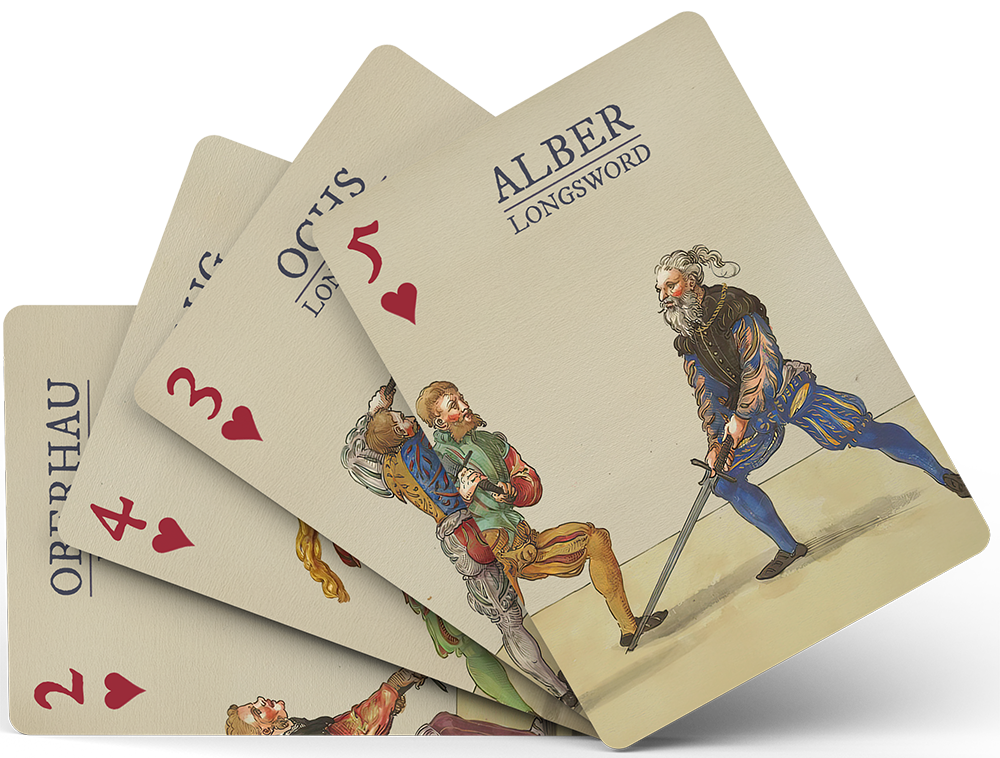 In the Hearts (Longsword) suit, you’ll find cards with positions and techniques such as: Oberhau, Ochs, Pflug, Alber, Vom Tag, Zwerchhau, Krumb, Thrust from Pflug, Winding, Longsword Anatomy, Example of a Type XIX Longsword, Kriegsmesser, Zweihänder Type XIII.