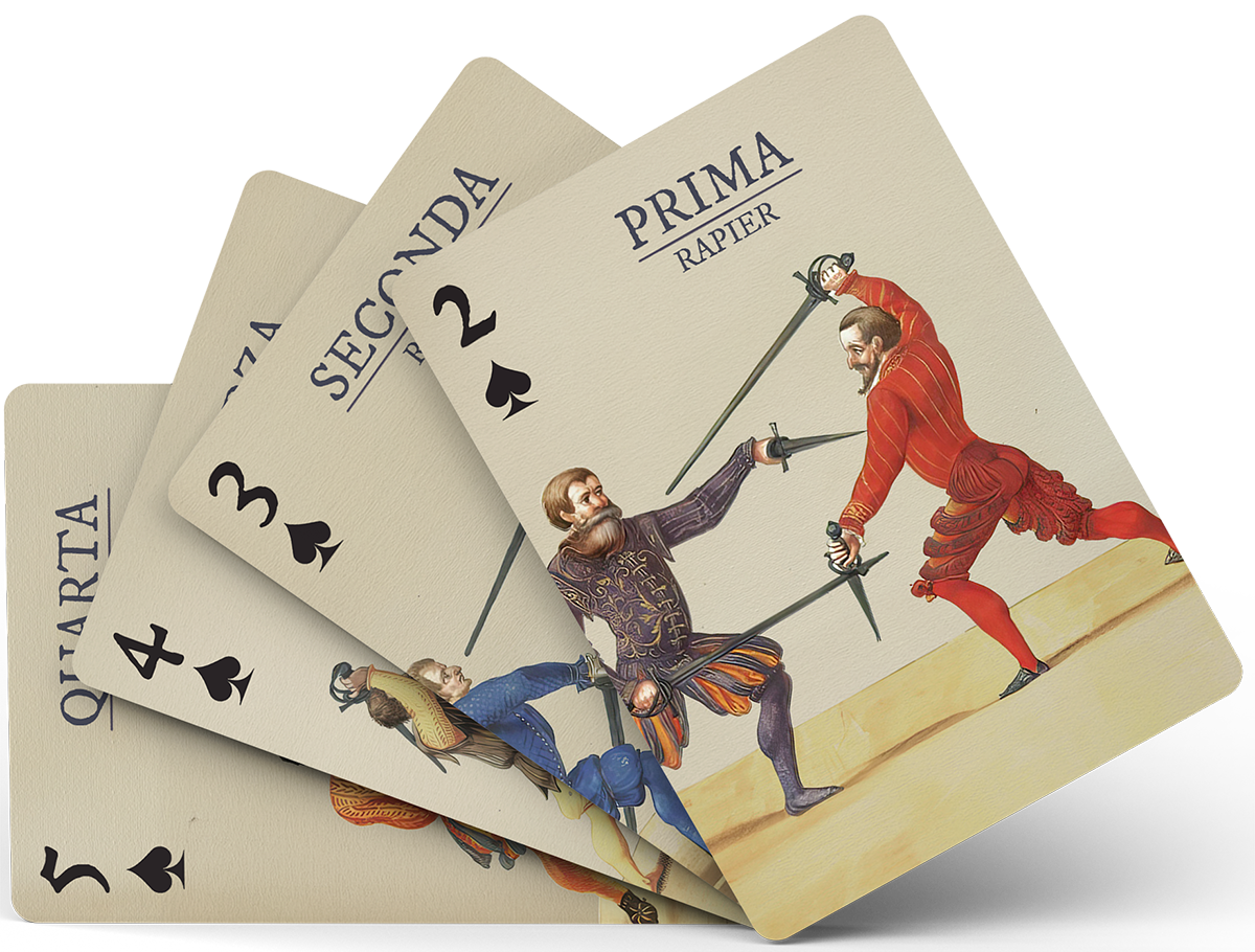 In the Spades (Rapier) suit, you’ll find cards with positions and techniques such as: Prima, Seconda, Terza, Quarta, Affondo, Finta, Cavazione, Mandritto and Riverso, Passata Sotto, Rapier Parts, Spain Rapier & Dagger, Italy Spain Rapier & Dagger, Swept Hilt Rapier.