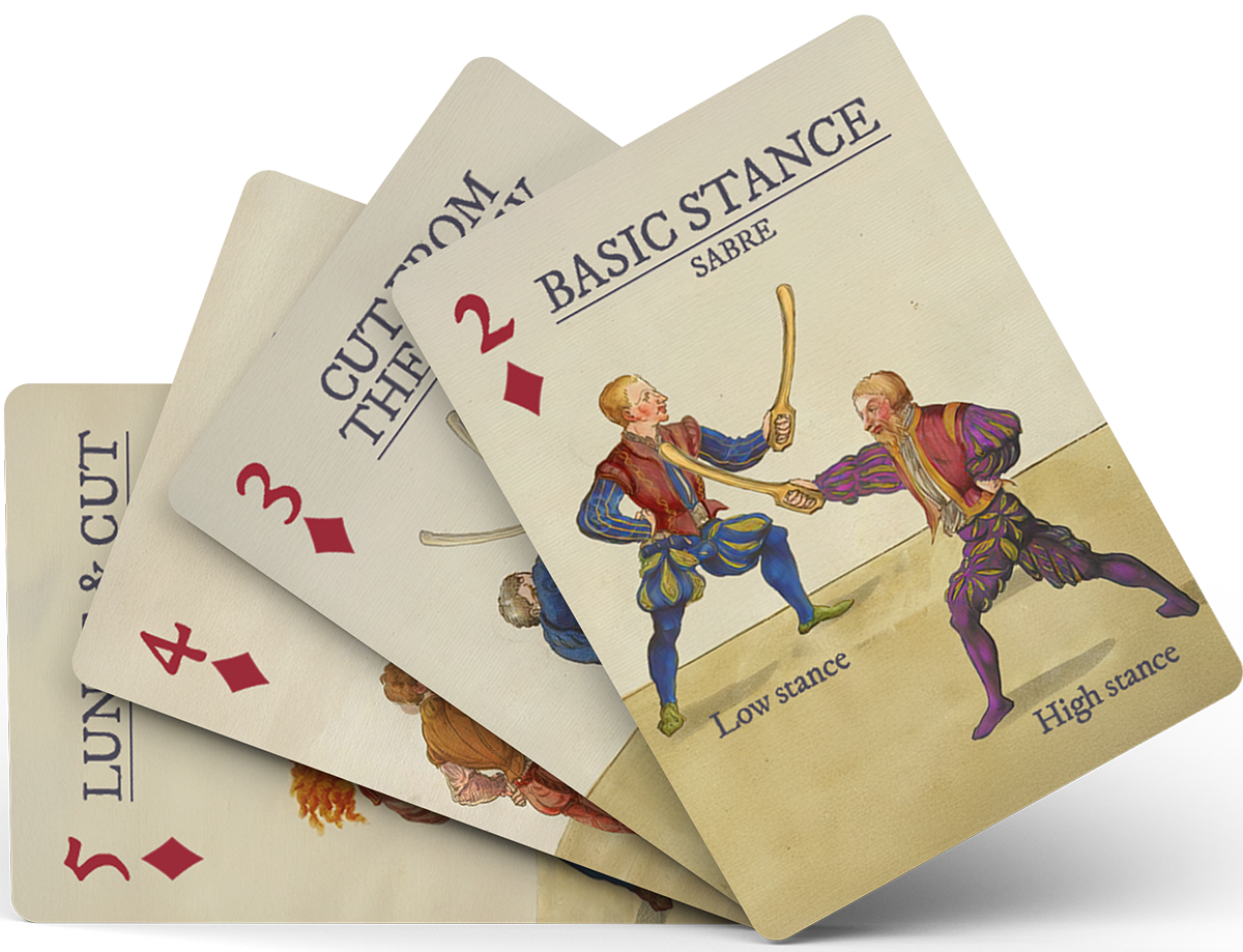In the Diamonds (Sabre) suit, you’ll find cards with positions and techniques such as: Basic Stance High and Low, Basic Guard, Lunge & Cut, Swinging Cut, Cut from the Elbow, Thrust, Hand Cut, Dodge, Saber Parts, Cavalry Saber, Polish-Hungarian Saber, Sabre Cut.